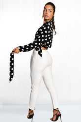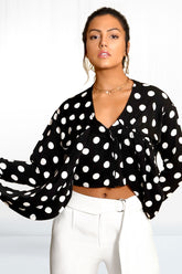 A timeless classic, this polkadot wrap cropped top is the perfect piece for injecting a little bit of elegance into any wardrobe. Cut to the waist with a flattering V-neck interpretation and softly draped sleeves, the fitted bodice ensures a crisp, sophisticated silhouette. Refined and dainty, this is a piece that will make a statement - without overpowering the outfit.