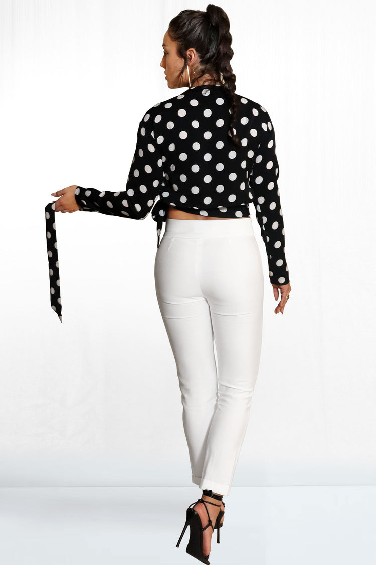 A timeless classic, this polkadot wrap cropped top is the perfect piece for injecting a little bit of elegance into any wardrobe. Cut to the waist with a flattering V-neck interpretation and softly draped sleeves, the fitted bodice ensures a crisp, sophisticated silhouette. Refined and dainty, this is a piece that will make a statement - without overpowering the outfit.