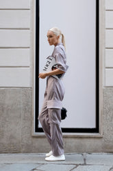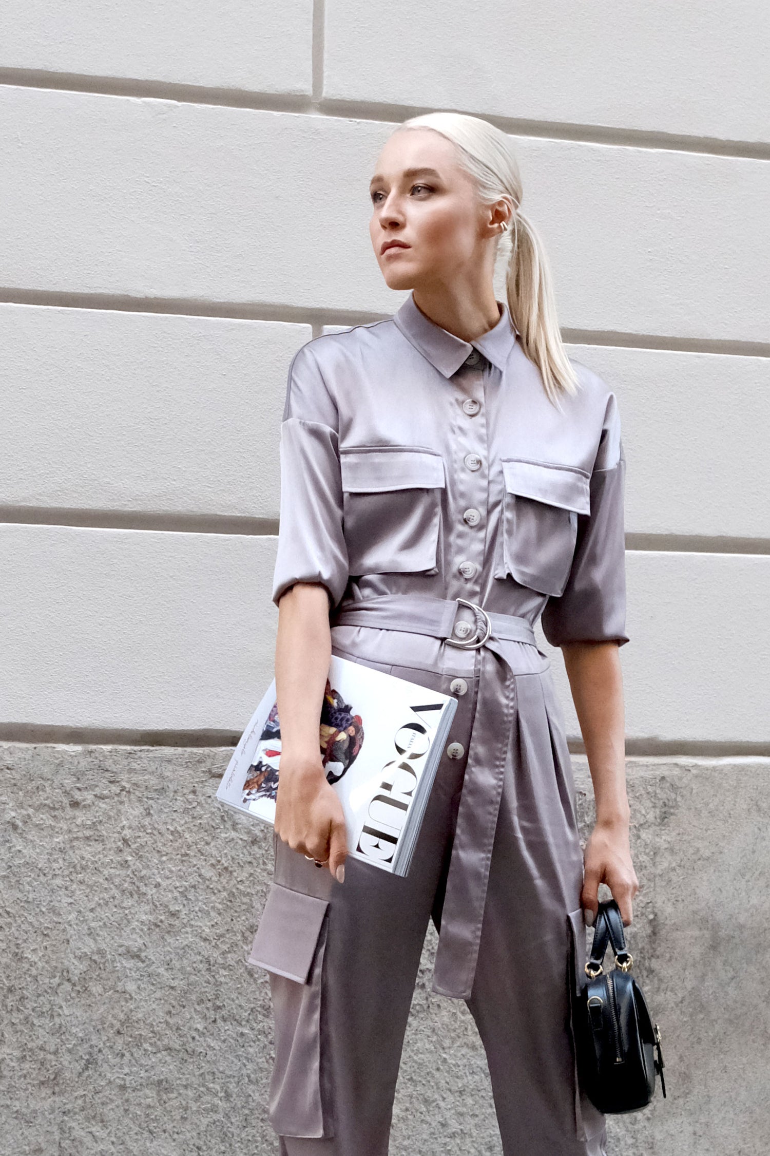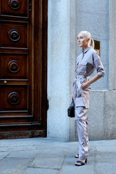 Crafted from a sumptuous silky fabric, this Milano Silky Cargo Jumpsuit is a luxurious take on the classic cargo jumpsuit. This timeless piece features a belted waist, high waist fit, straight leg cargo pants and darts in the waist for a sleek silhouette. Its oversized breast pockets and button down front create a polished finish, while its mini collar adds a subtle hint of sophistication. Perfect for the fashionista who wants to look stylish and chic.