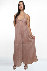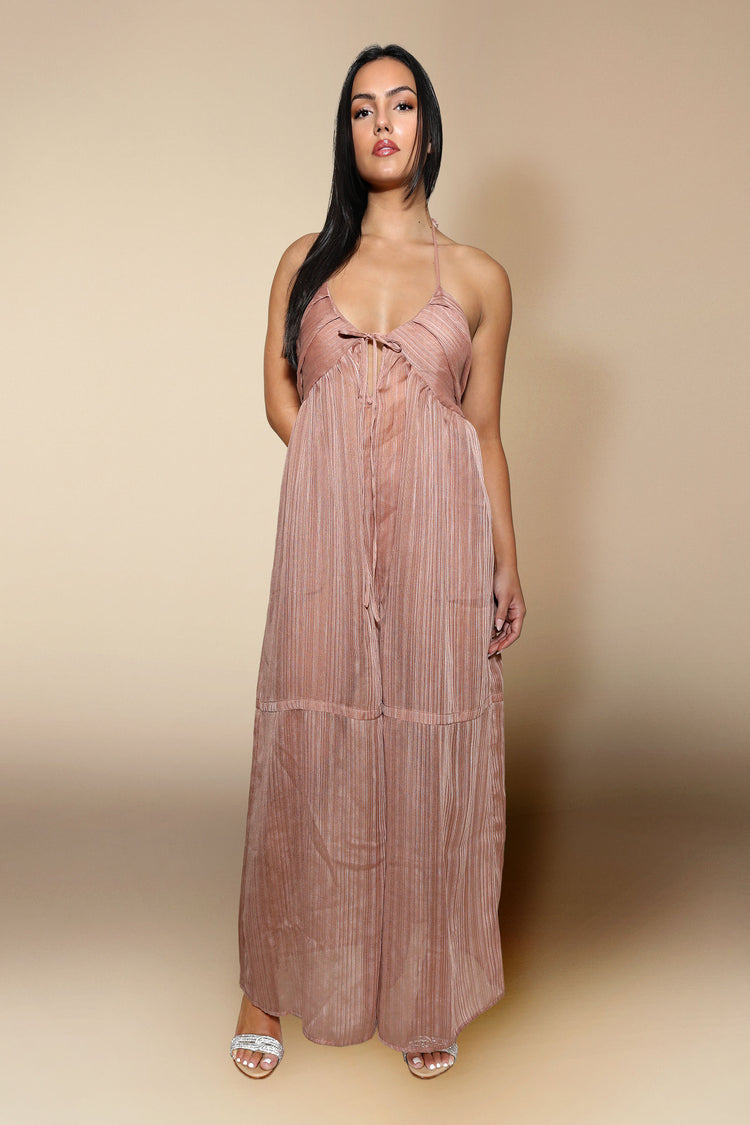 Lilyana Flowy Jumpsuit is the epitome of elegance and sophistication. Crafted exquisitely from sheer fabric, this jumpsuit features a flowy wide leg pant, halter neck, and ties in the back to create an aura of tasteful allure. The front tie on the bralette adds subtle class, while an internal bodysuit provides an extra touch of synched-in style. Finally, a unique stripe design completes the look of refined femininity.