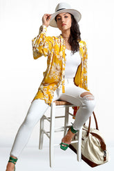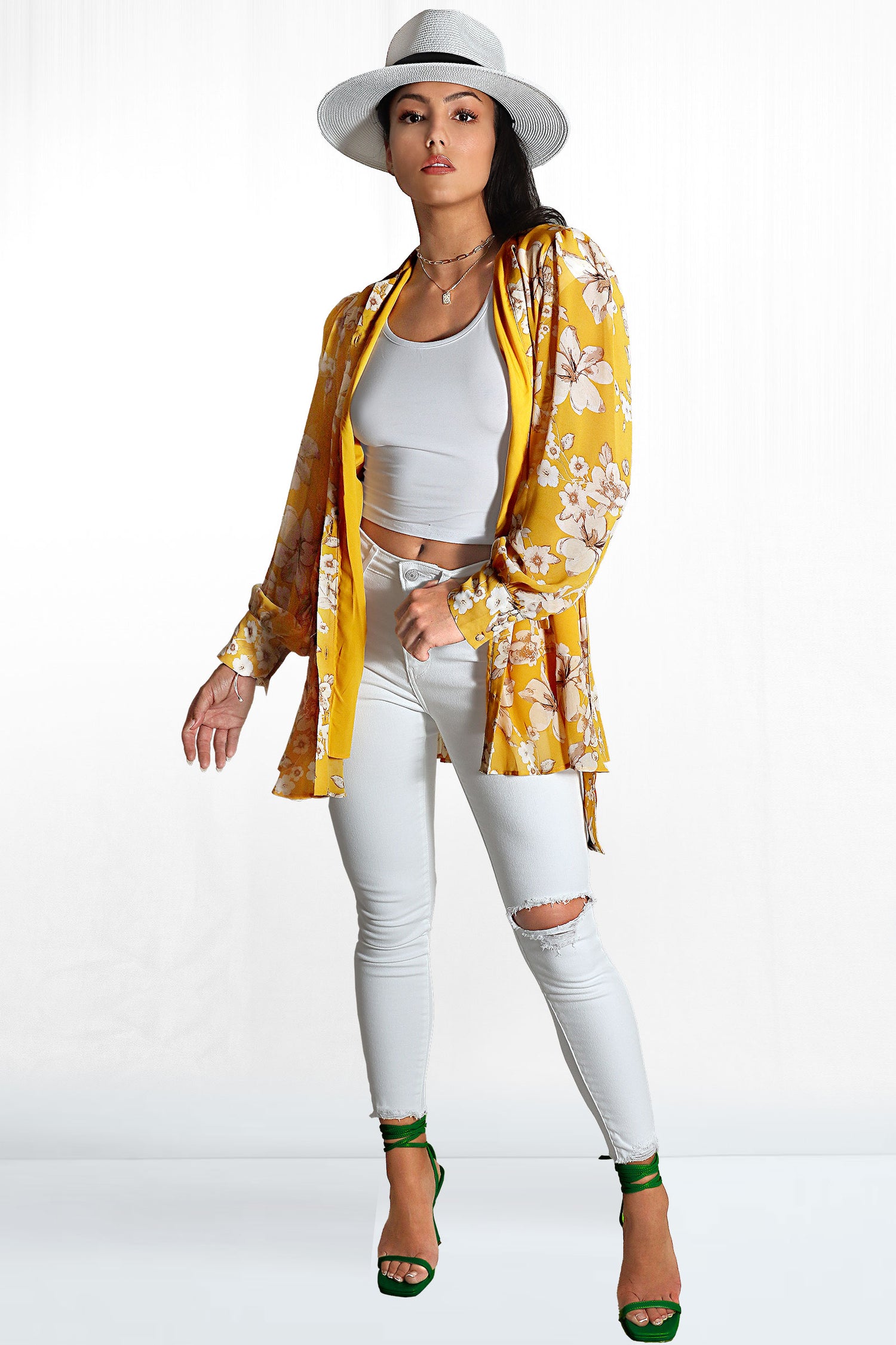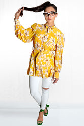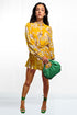 A custom yellow floral print makes this mini dress a true one-of-a-kind. Defined by its waist seam and flattering shape, it features a handcrafted pleated belt and whimsical ruffle hem. Perfect for any occasion, it feels sexy on with its neck tie, bello sleeve, and Victorian wide sleeve and button cuff design. Flattering in the hips, this piece is truly an exclusive work of art. The perfect look for any occasion, from vacation to business meetings.